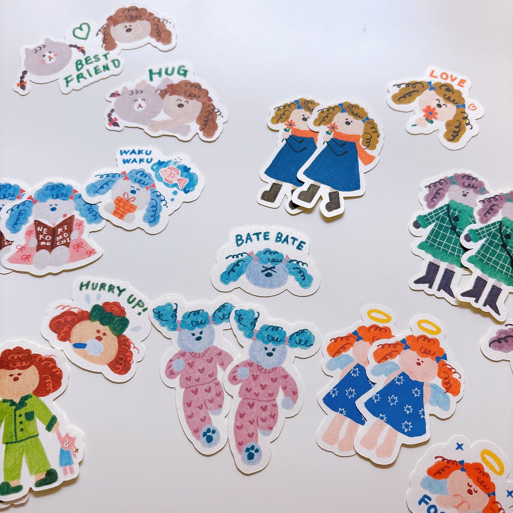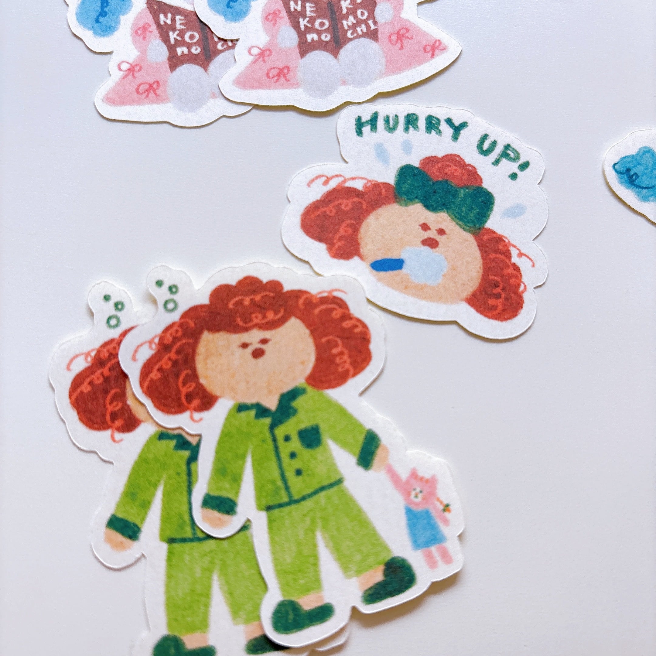 寝起きで髪が爆発している子や、お友達のみつあみねこの気持ちを研究している子、